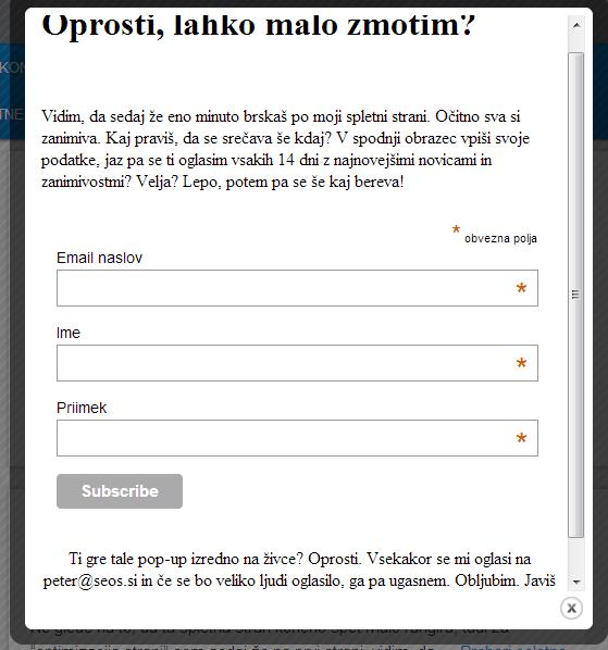 Zakaj ga umikam? Občutek imam, da ne deluje. Število oseb, ki se naročate na mailinge je majhno in občutek imam, da pop-up ni velik del tega. Ja, nisem nastavil stvari tako, da bi lahko zasledoval kdo se prijavi preko pop-upa, kdo se prijavi preko pristajalne strani in kdo se prijavi preko desnega menija, ampak tako pač je 😀 Vem, moral bi, ampak zdaj je že mimo :d