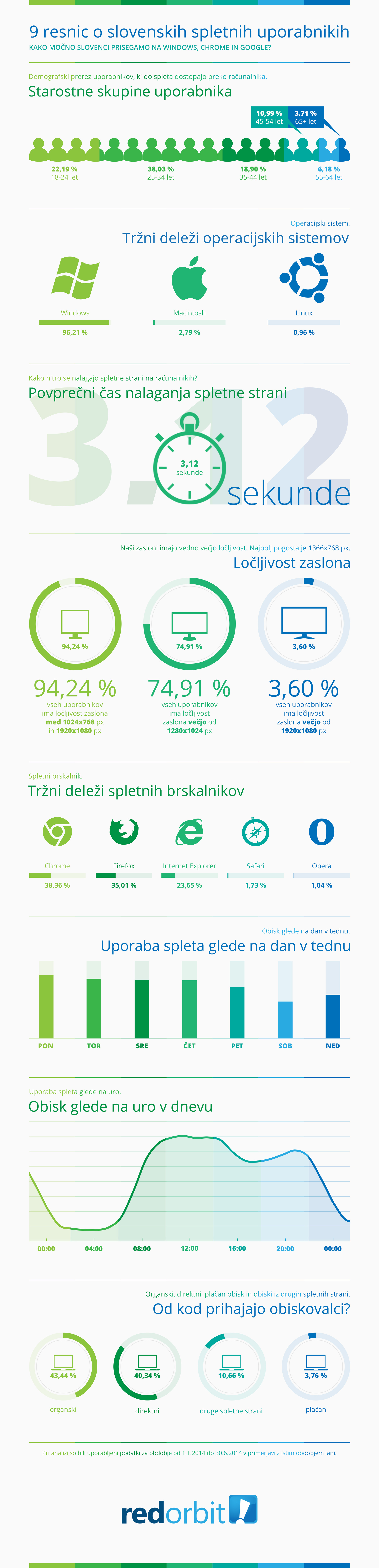 Analizirali smo demografske podatke uporabnikov, hitrost nalaganja spletnih strani, resolucije zaslonov (ta podatek je posebej zanimiv za vse, ki razvijajo spletne strani), tržne deleže operacijskih sistemov in spletnih brskalnikov, vire obiskovalcev ter tudi časovno razpršenost (dan v tednu, ura v dnevu) uporabe spleta. Posebej zanimivi so podatki iz analize tržnih deležev spletnih brskalnikov in operacijskih sistemov.