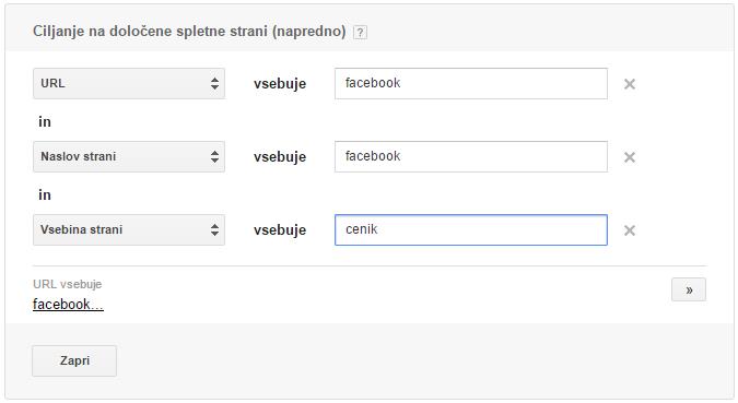 Ob teh nastavitvah bo Google upošteval za izbor ključnih besed le 6 strani, ki jih vrnejo zgornji pogoji (na prvi sliki). Ključne besede, pod katerimi se bo vaš oglas prikazal, bodo povezane z vsebino, torej v tem primeru s facebookom in cenami oglaševanja na facebooku.